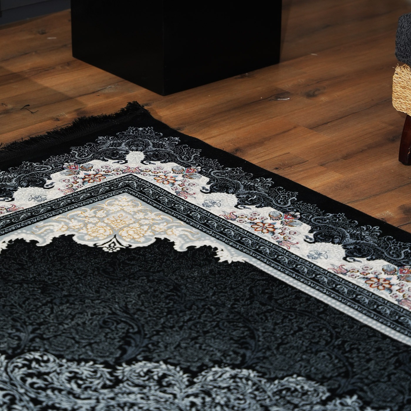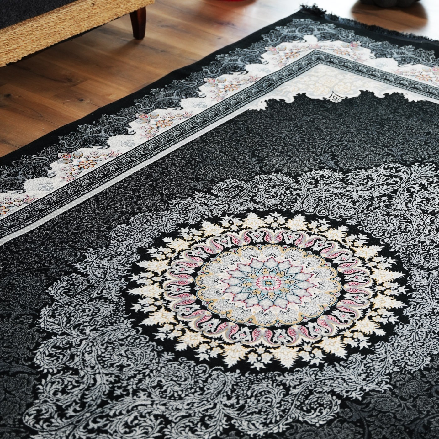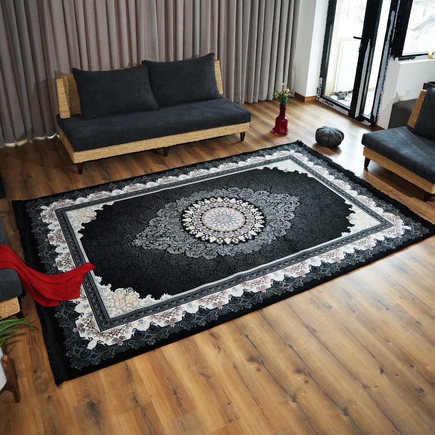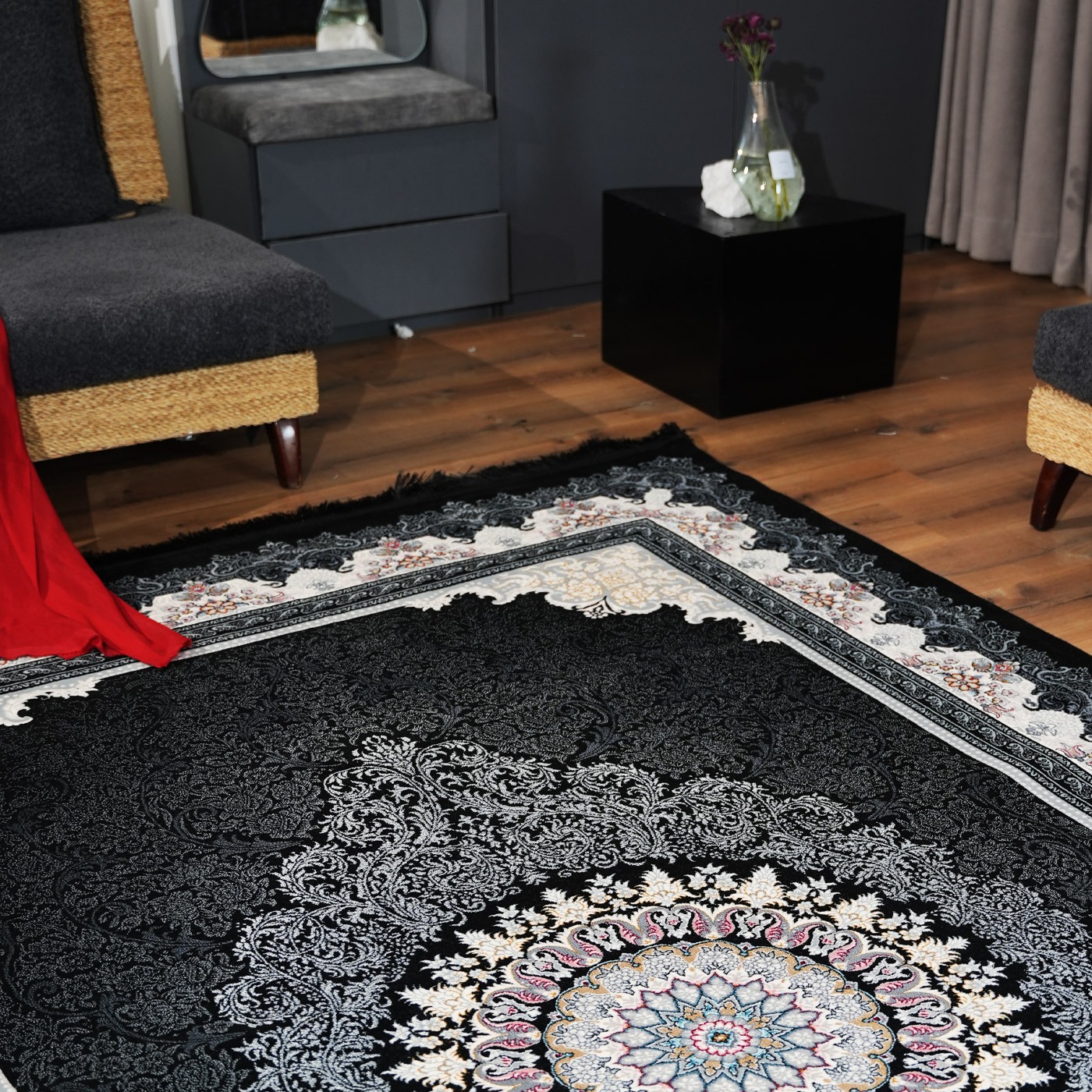فرش دلاریس سرمهای در ابعاد ۱۲، ۹، ۶ متری، همچنین قالیچه و کناره موجود است.